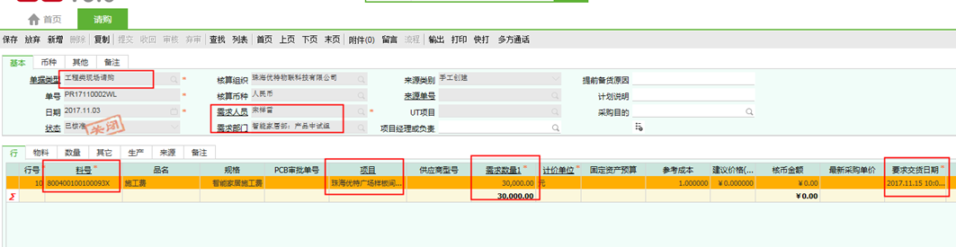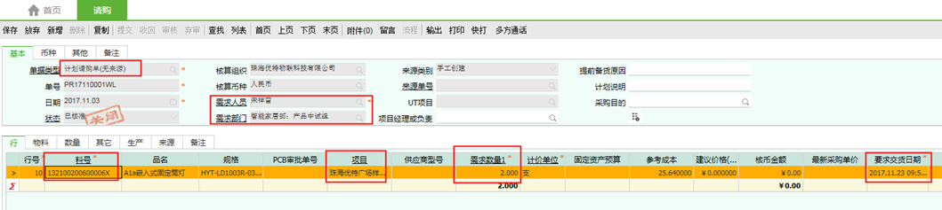 菜单:供应链 > 采购管理 > 采购申请 > 请购