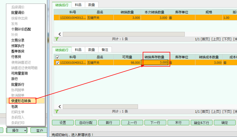 点击【操作】【快速形态转换】,在弹出界面录入【转换库存数量】