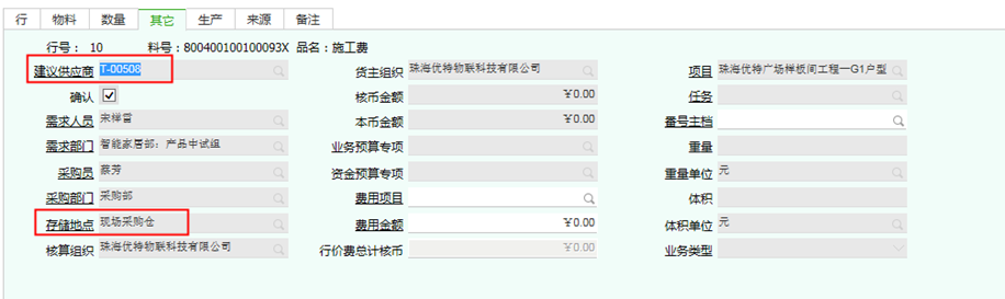 在行里录入【料号】、【项目】、【需求数量】,并到行的【其它】标签页里,录入【建议供应商】(如果没有,需要邮件或在请购备注里给采购人员说明),修改【存储地点】为"现场采购仓"