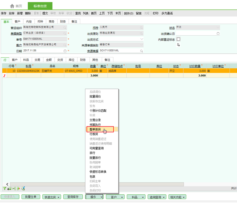 菜单:供应链 > 销售管理 > 出货 > 标准出货