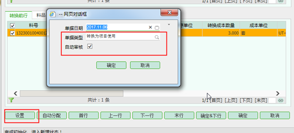 如果是第一次做,还需要点击【设置】,在弹出界面录入【单据类型】为"转换项目使用",自动审核打√