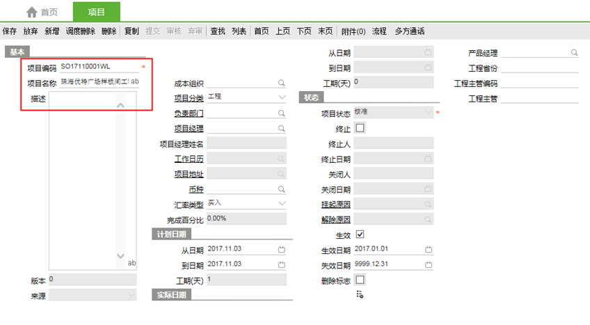 填写完毕后,点击【保存】,系统生成单号。然后依据1.2创建项目