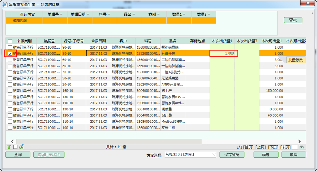 选择需要出货的行,确认【本次出货量1】,选择完毕后点击【确定】,生成出货单