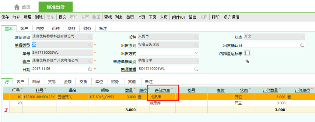 填写完毕后,点击【保存】,确认无误后点击【提交】,同时创建对应的销售标准出货单,把两个单据同时交给仓库(可以使用邮件方式),让仓库审核