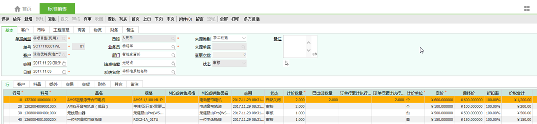 其他行都添加完毕后,确认无误后,点击【提交】【审核】,单据状态为"已审核"后,才能做标准出货单。
