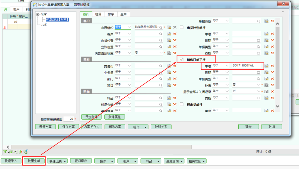 点击【批量生单】,在销售订单子行的【单号】里录入需要出货的订单编码,点击【确定】