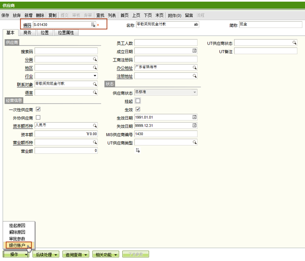 到【基础设置】【供应商】,查找到S-01430供应商,点击【操作】【银行账户】