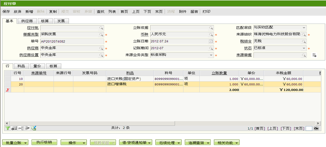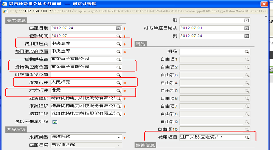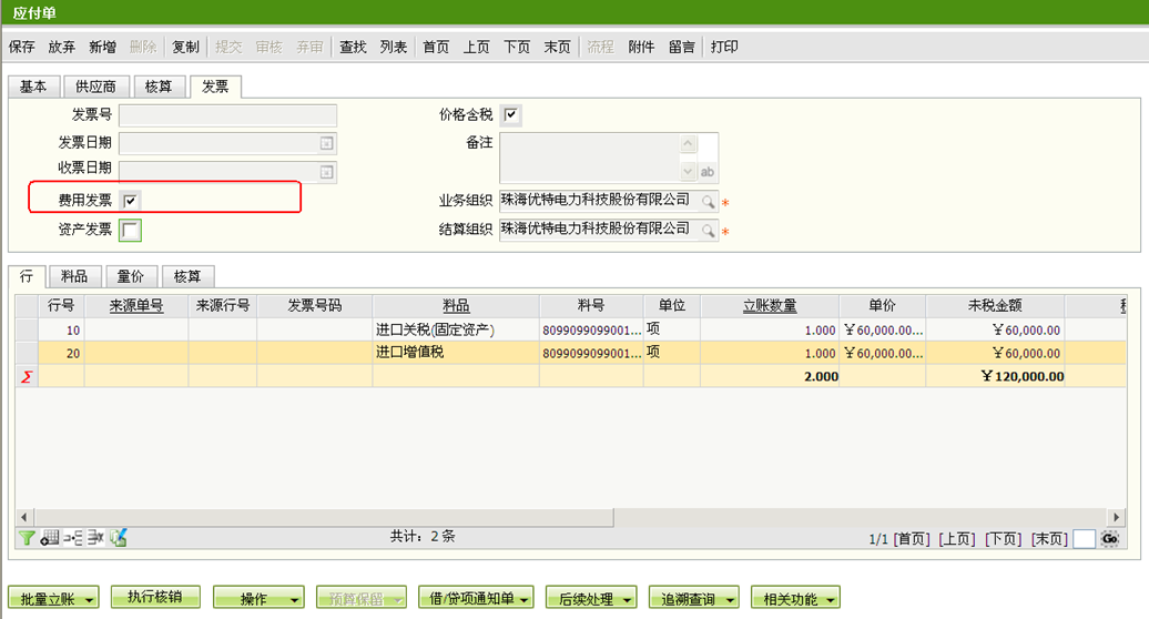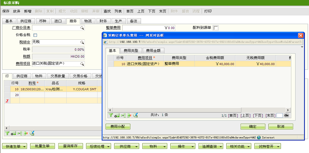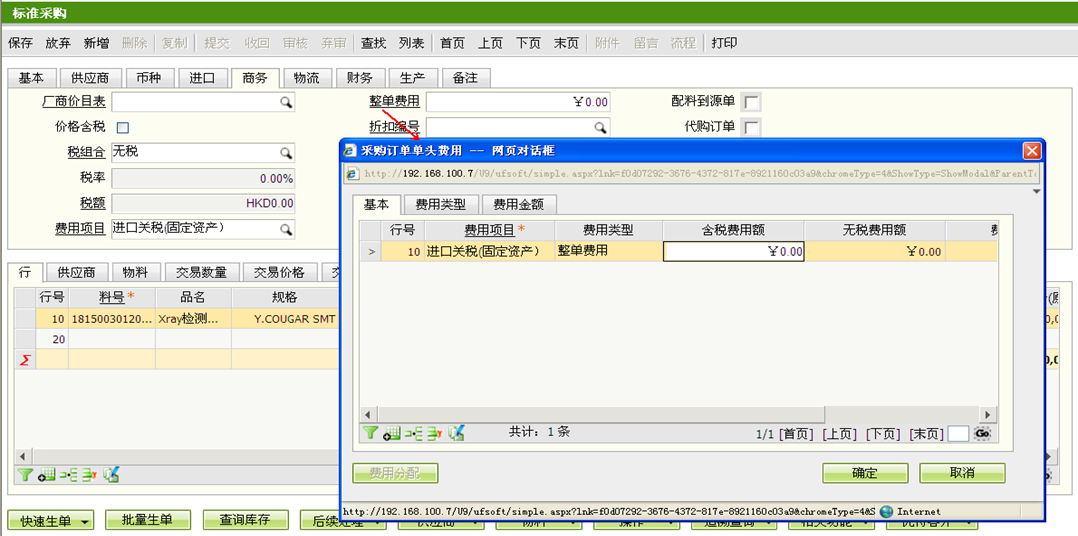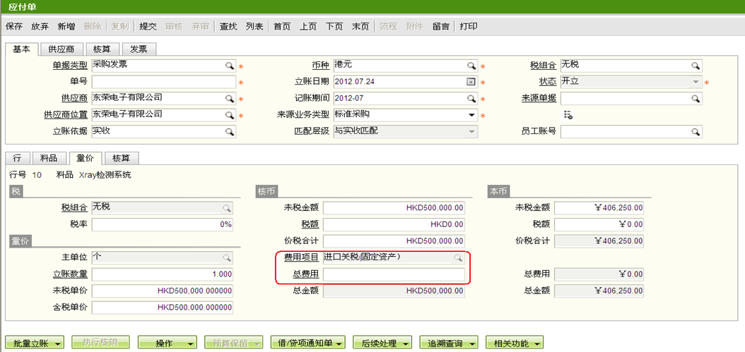 应付单表体里面的费用项目-关税,在立货物供应商的应付单时,费用项目的金额为零