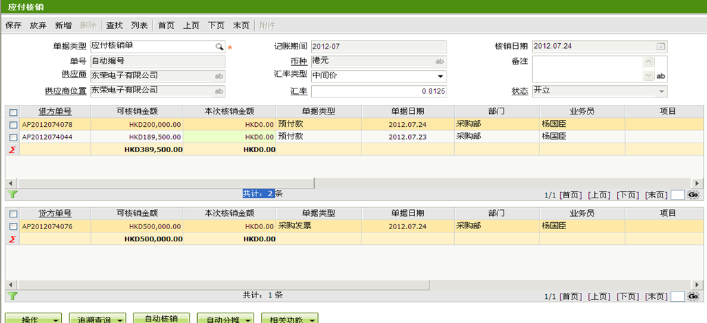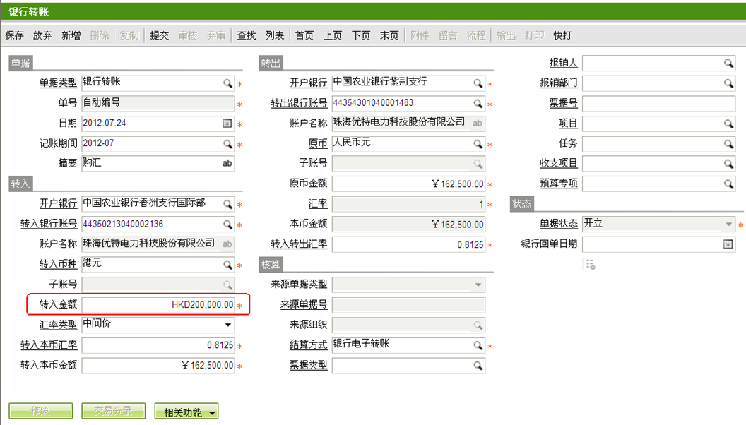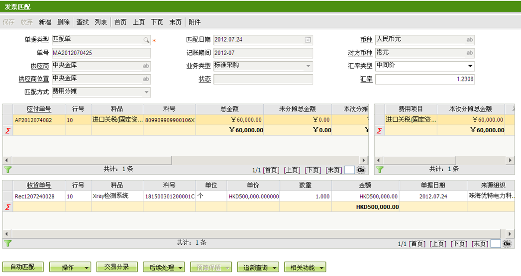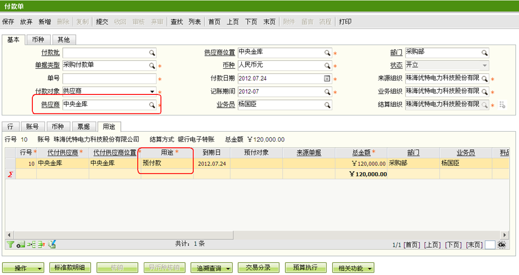 (1)进口商品一般都需要部分或者全部预付款项,选择对应的采购订单,填写对应的付款币种和付款金额。