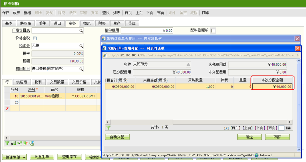 填写预估关税,然后进行费用分配(按照金额比例分配费用)